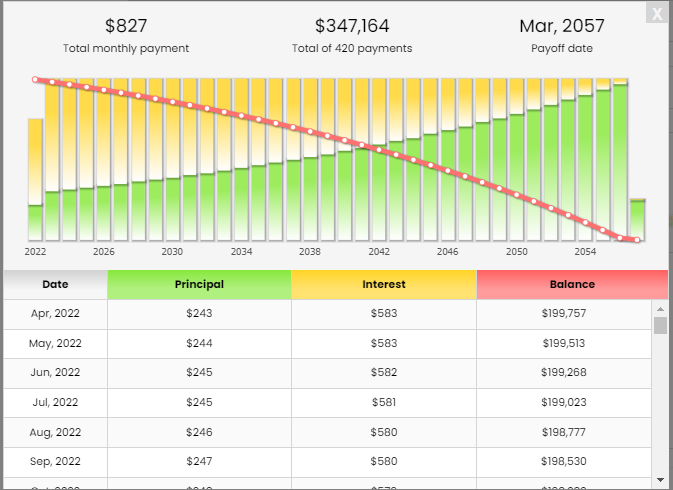 Graf di atas, adalah hasil daripada total loan rumah saya buat sebanyak RM 200K, untuk 35 tahun. Dan dapat bulanan sebanyak RM 827, andai kata interest 3.5%
